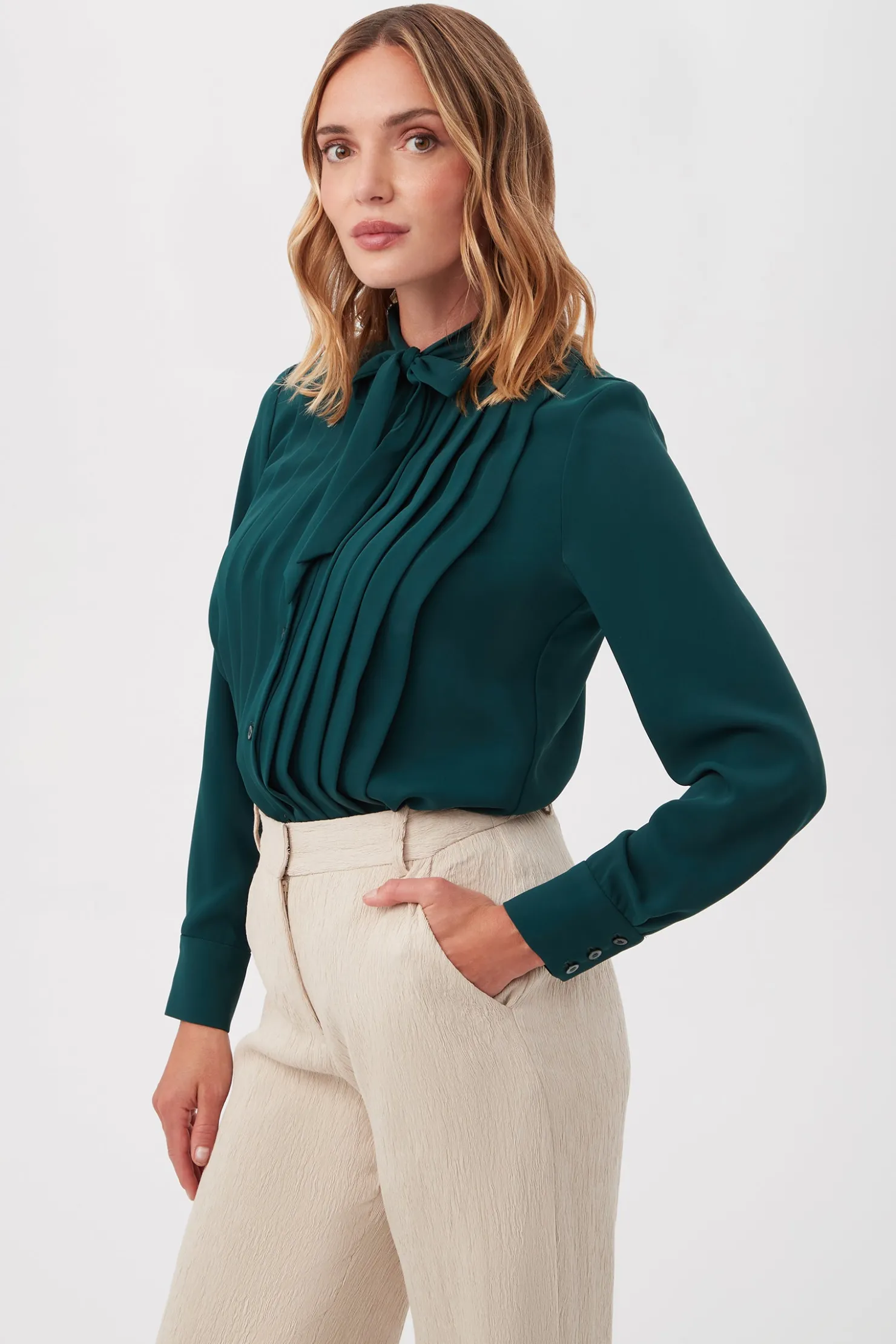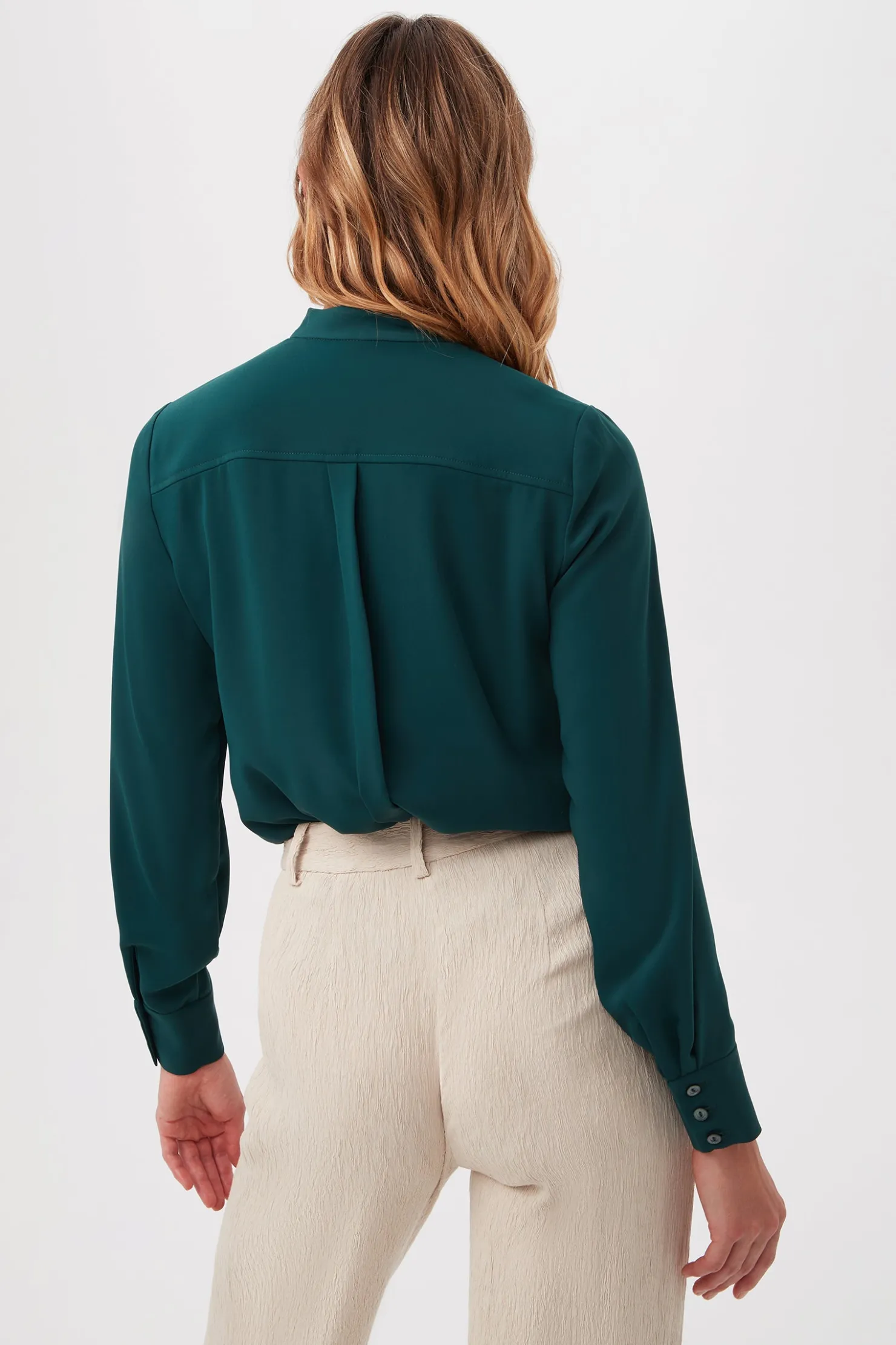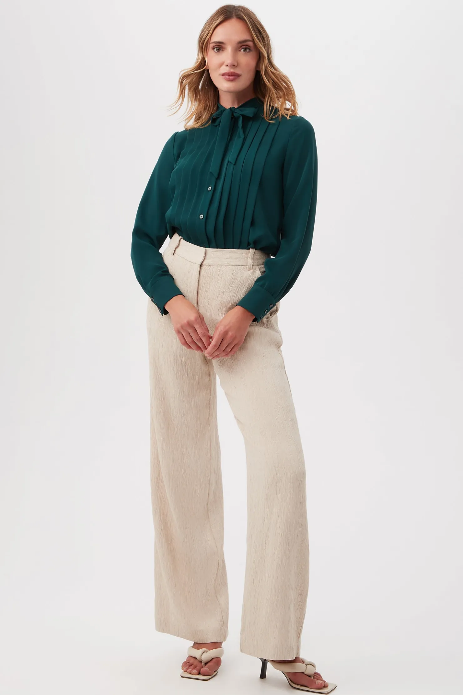 Elevate your fall wardrobe with this long-sleeve, button-up shirt, with a mandarin collar, front tuck detailing, and spaghetti ties at the neck. Pair this long-sleeve shirt with our plaid pants for a fall-ready look.