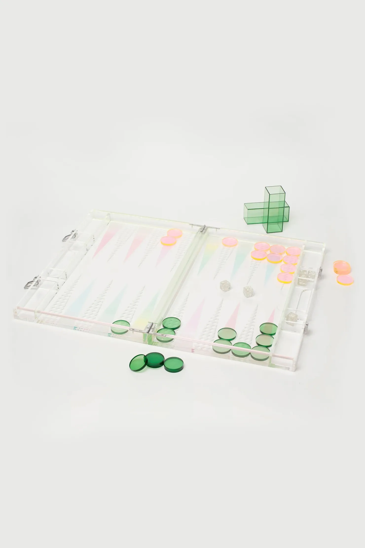 Give yourself a competitive edge with this luxurious rendition of a popular classic. Our stunningly transparent Lucite game sets are a must-have for any lover of retro style and kaleidoscopic color, designed to be just as beautiful out on display as during a game. With clear die, vibrant two-tone chips, and a pastel ombré base, the Aurora tabletop backgammon set will bring a sophisticated pop of color to any home.